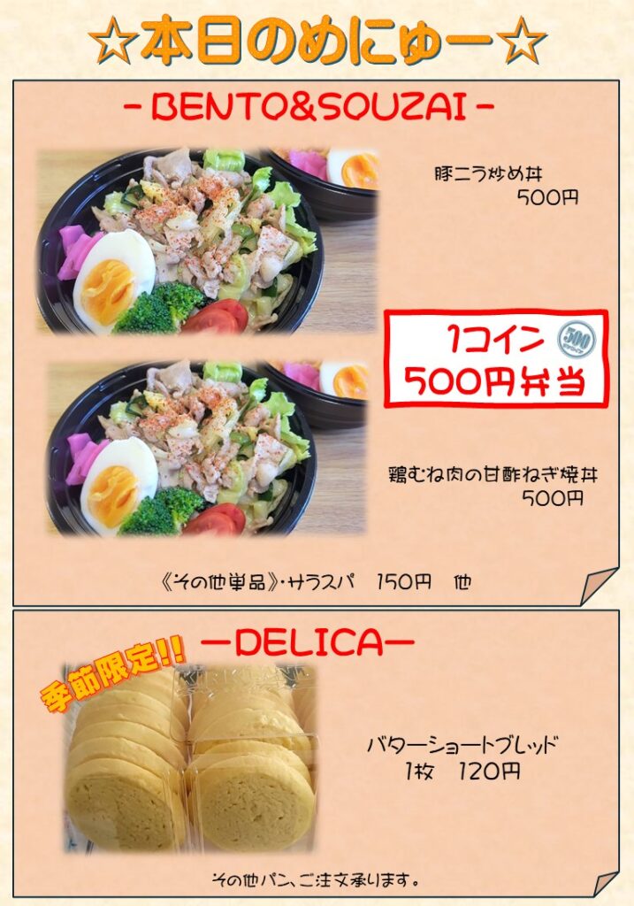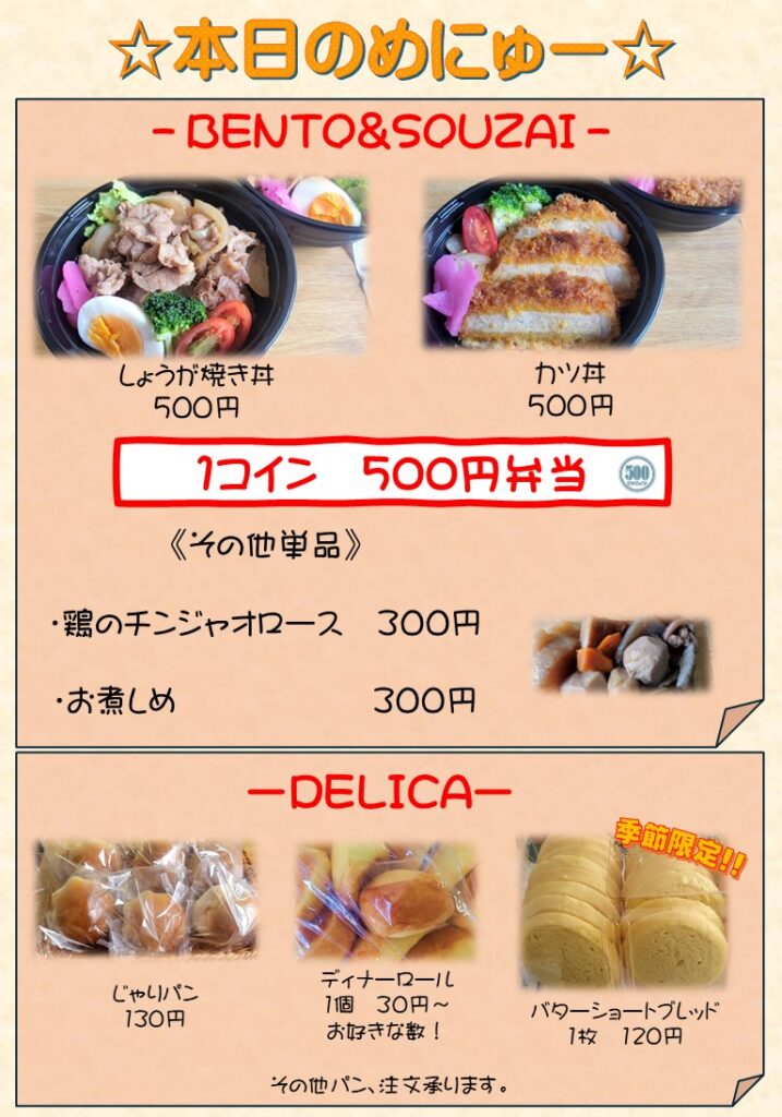 🍱✨本日のめにゅー✨🍞 いつもご利用ありがとうございます!本日は人気のワンコイン弁当から、新しく食べやすくなったデリカパンまで、お得でおいしいラインナップをご紹介します😊 🍱 BENTO & SOUZAI(お弁... -