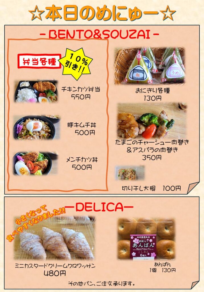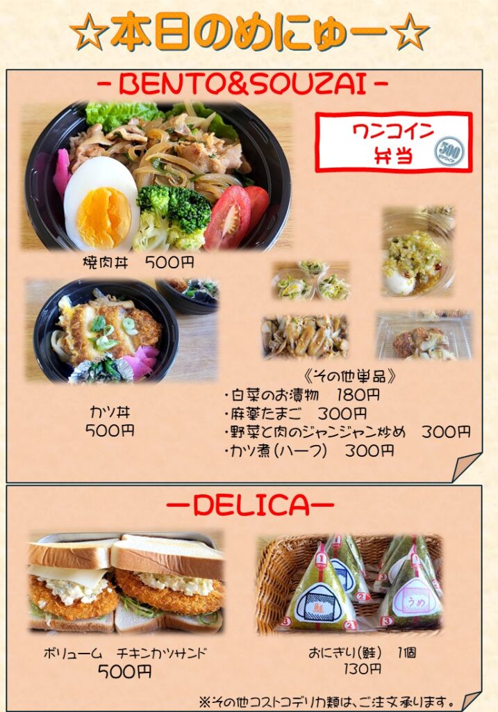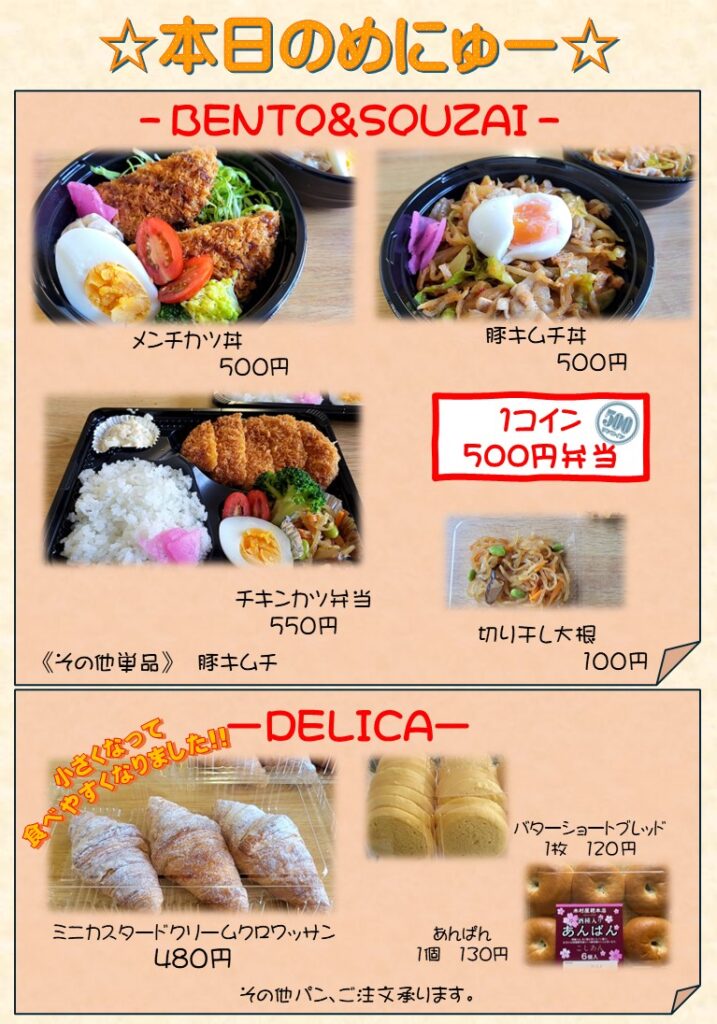 🍱 BENTO & SOUZAI (弁当各種10%引き) 弁当類 チキンカツ弁当 550円 豚キムチ丼 500円 メンチカツ丼 500円 その他惣菜 おにぎり各種 130円 たまごのチャーシュー肉巻き&アスパラの肉巻き 350円 切り干し大根 100円 🥐 DELICA ... -