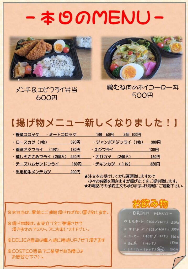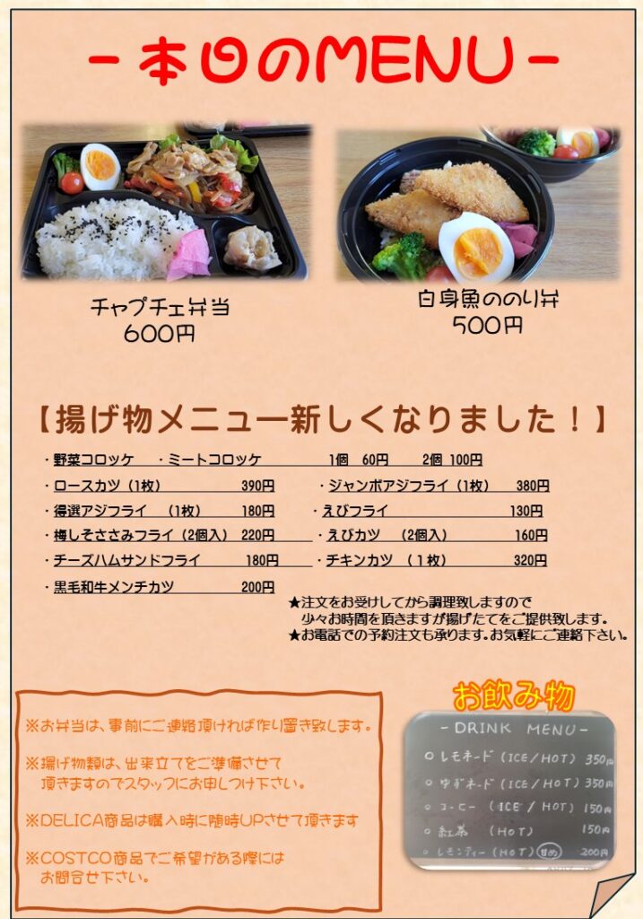 【水戸市】本日のお弁当|チャプチェ弁当・白身魚フライのり弁|テイクアウト対応