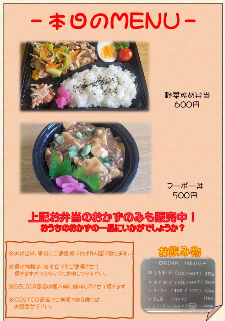 水戸市の手作り弁当屋Hyakka|野菜炒め弁当600円・マーボー丼500円